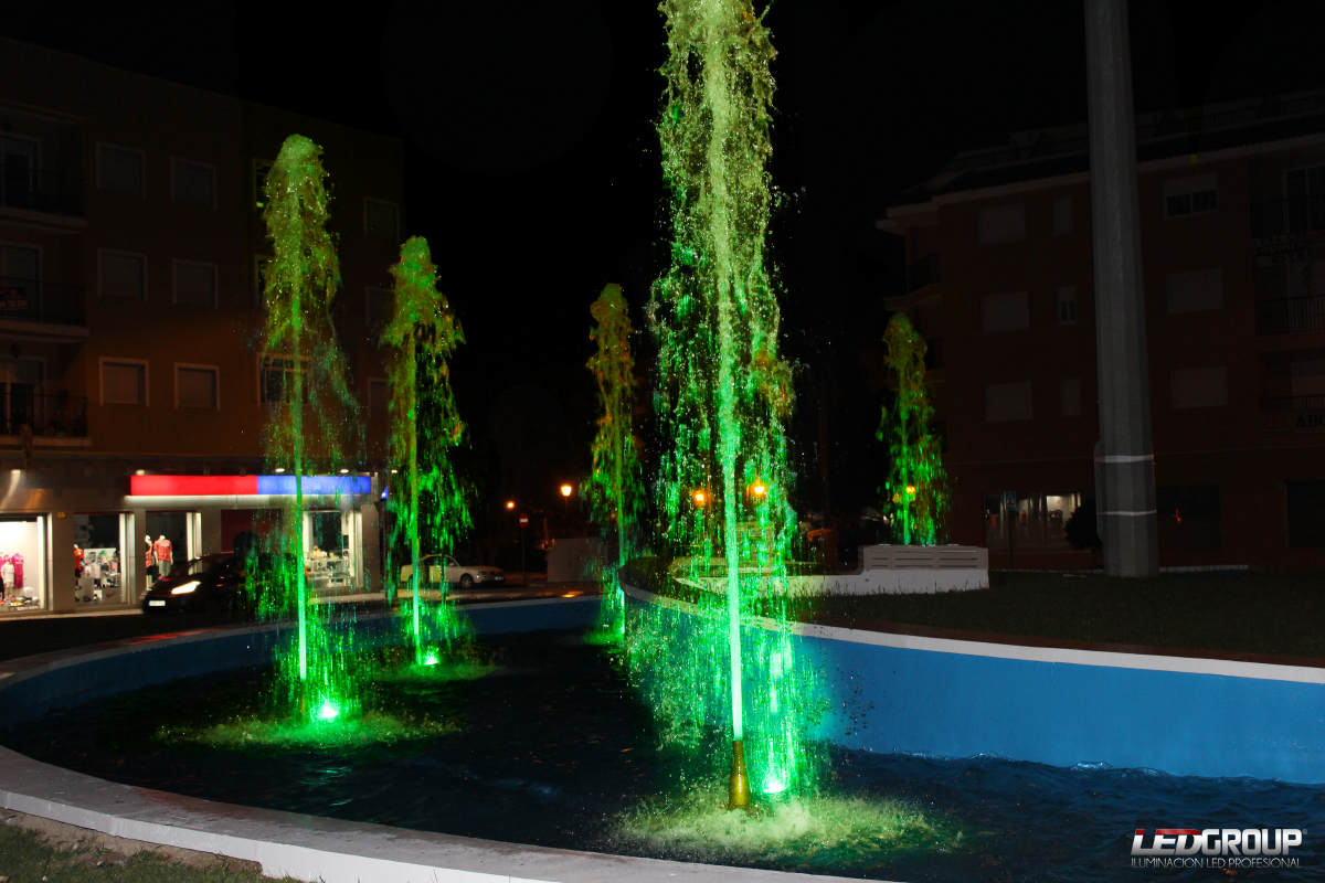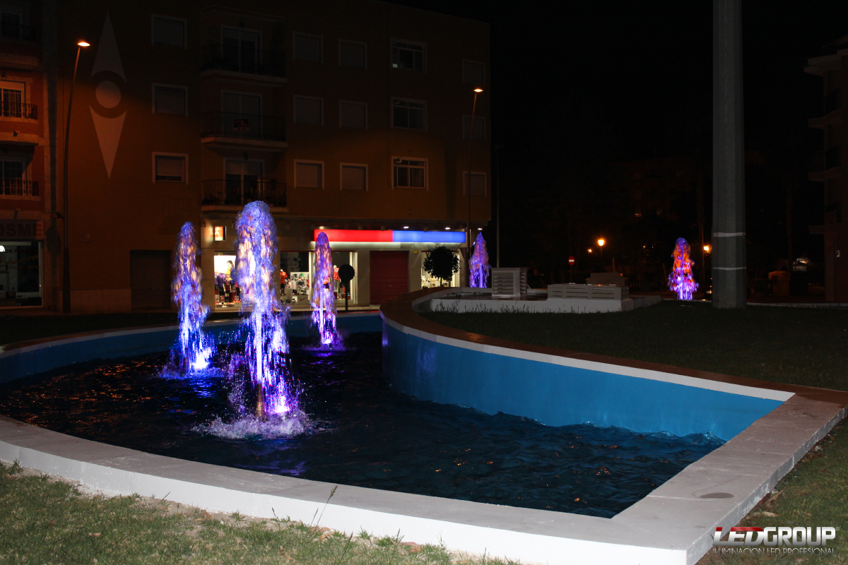 Iluminación de la fuente mediante proyectores led RGB subacuáticos, aportando luminosidad multicolor a las secuencias programadas de agua de hasta 8 metros de altura.